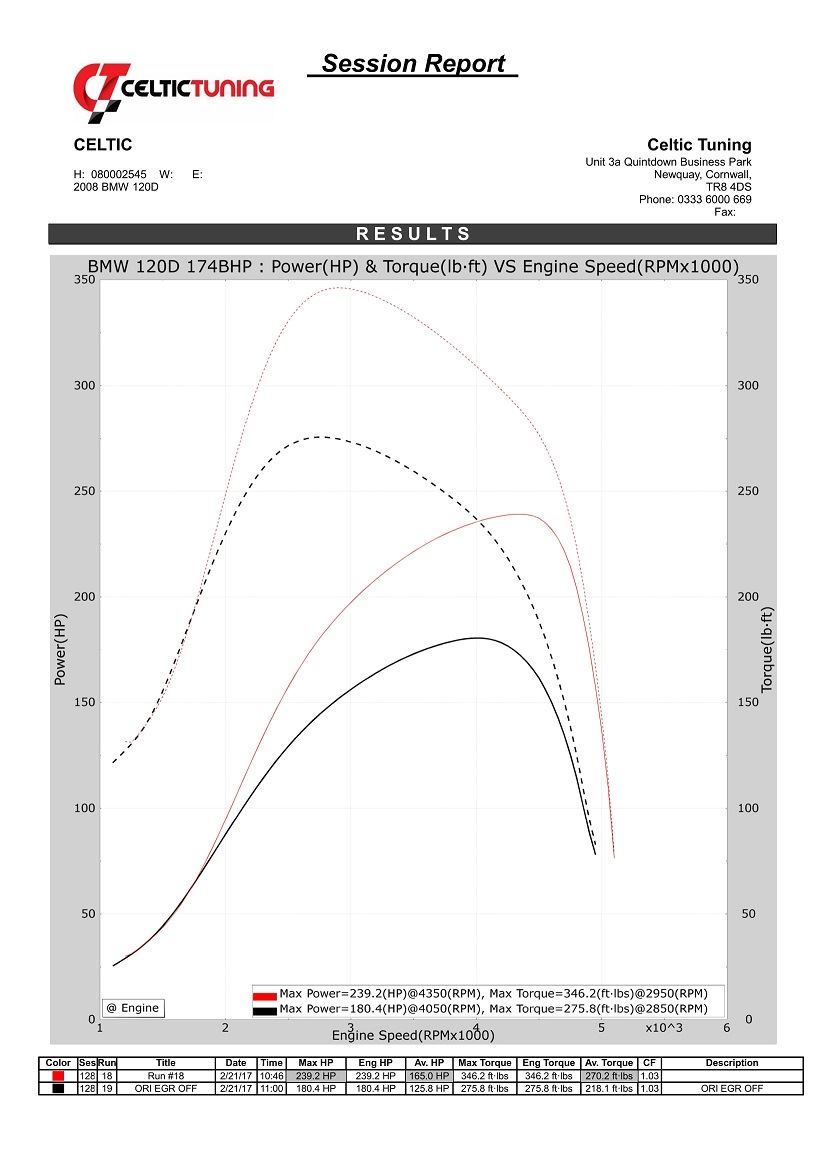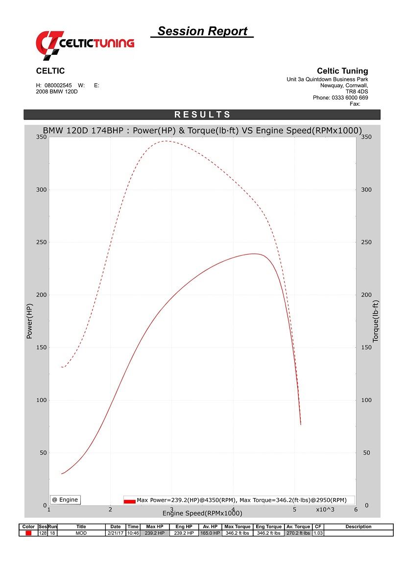 Chart 1 is a 120d 174bhp with both the before run and the modified run on the same chart. In this you can clearly see the gains as a means of comparison and the figures have some relevance as to what you are receiving from the tuning.